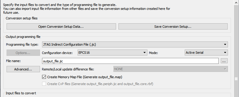 当生成固化文件jic时,在转换程序文件(Convert Programming File)窗口中,在配置设备(Configuration device)选项卡中请选择EPCS16