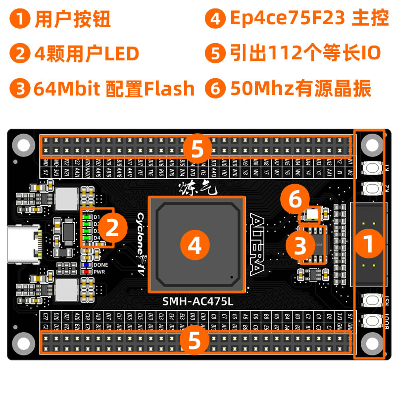AC475L是思妙电子推出的炼气系列开发板中的一款。主控使用Altera Cyclone IV E 系列 ep4ce75(f23) 封装FPGA芯片。
